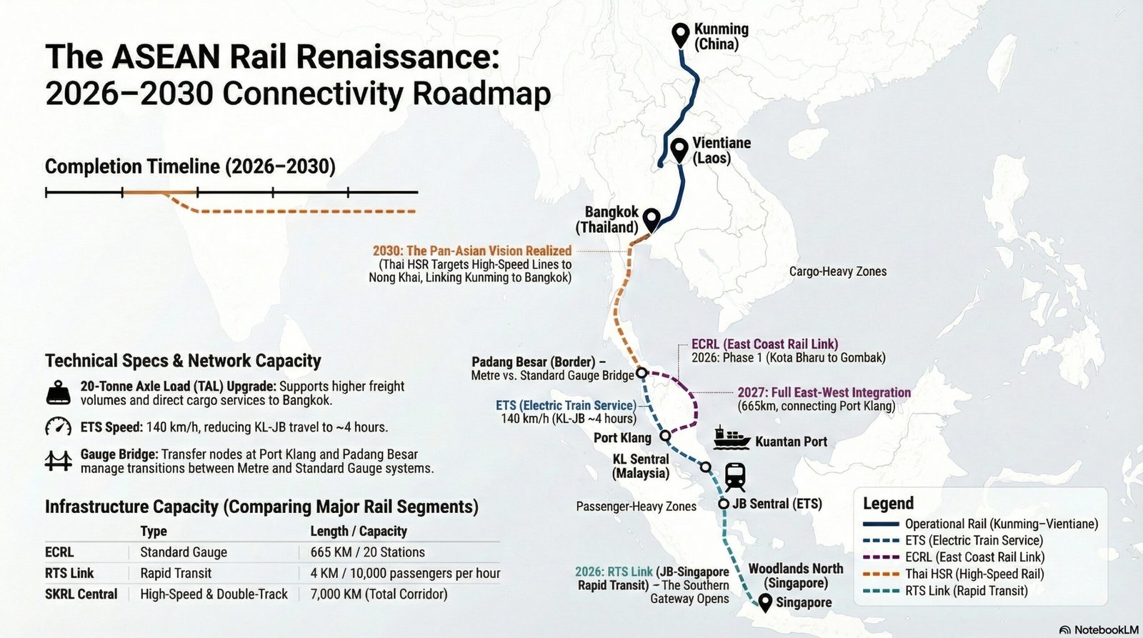 - Padang Besaron the Thailand border is emerging as a key rail gateway, part of the broader Pan-Asian Railway vision connecting Singapore to Kunming.